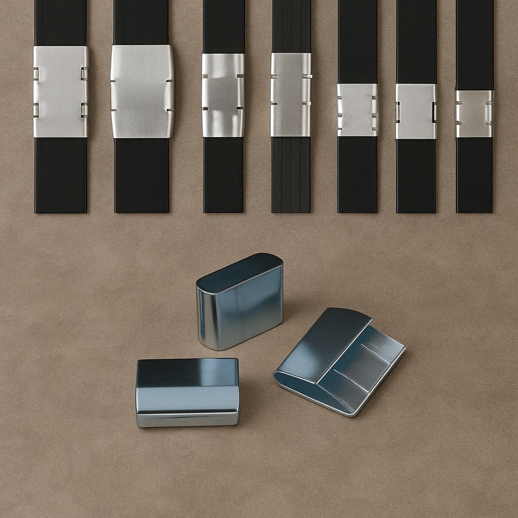 Demir saç malzemeden üretilmiştir. Çelik çember tokası kullanım aşaması; öncelikle hali hazır durumda bulunan ürünün altından ve üstünden geçirerek, manuel çelik çember makinası ile gerdirme işlemi başlar, germe işlemi bittikten sonra çelik çember pensesi ile kenetlenir, daha sonra çelik çember makası ile çelik çember kesilir. ve çemberleme işlemi kolay ve hızlı bir şekilde sonlandırılır.